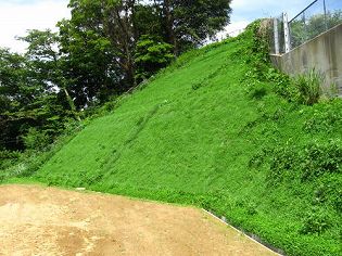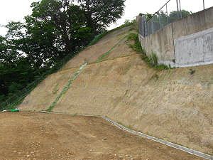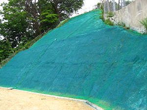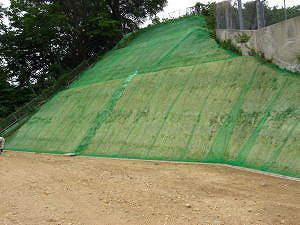 法面に12o×12oのポリネットを張りその上に種子吹付をします。